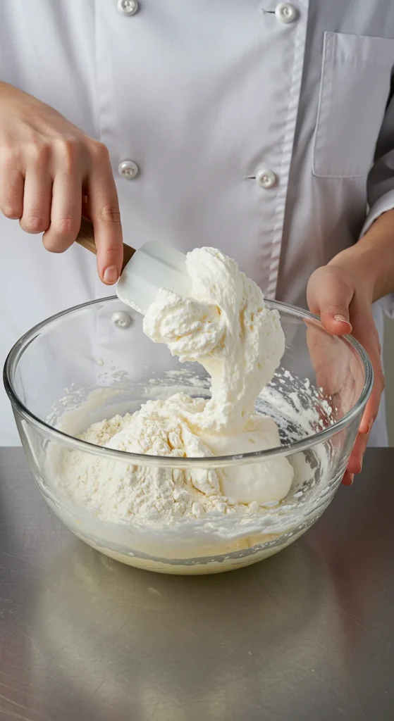 Sift the flour and remaining sugar together to remove any lumps. Gently fold this mixture into the egg whites in small batches. Use a spatula and a light hand—overmixing will deflate your meringue.