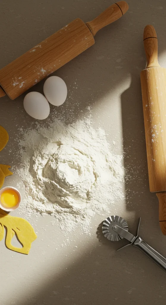 Start by creating a mound of flour on a clean surface. Use your hands or the bottom of a bowl to make a well in the center. Crack the eggs into the well, add a pinch of salt, and drizzle in a touch of olive oil if desired.