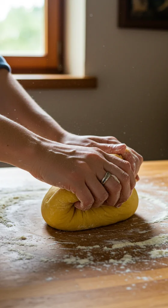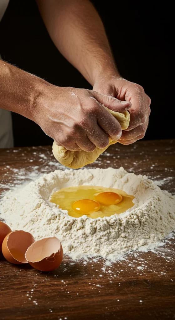 Using a fork, gently whisk the eggs, slowly pulling in flour from the edges. Keep going until a shaggy dough forms. Now, it’s time to get your hands messy—knead the dough for about 8–10 minutes until it becomes smooth and elastic.