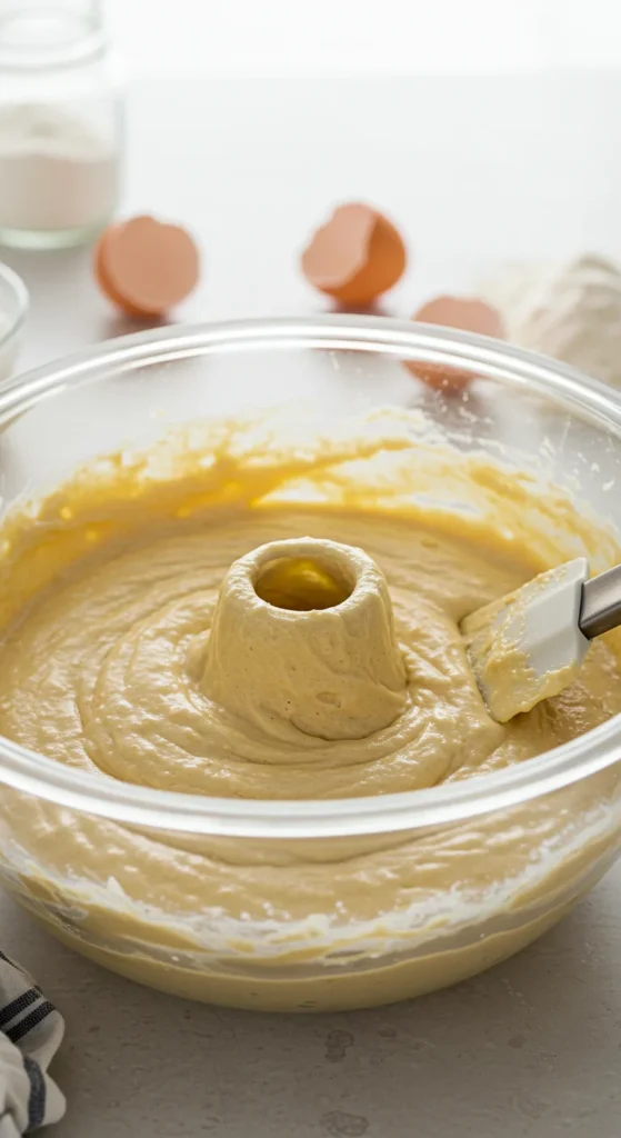 - Pour the batter into your greased Bundt pan, smoothing the top with a spatula.