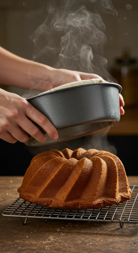 - Let the cake cool in the pan for 10–15 minutes. Cooling too long can make it stick, while flipping too soon risks breaking.